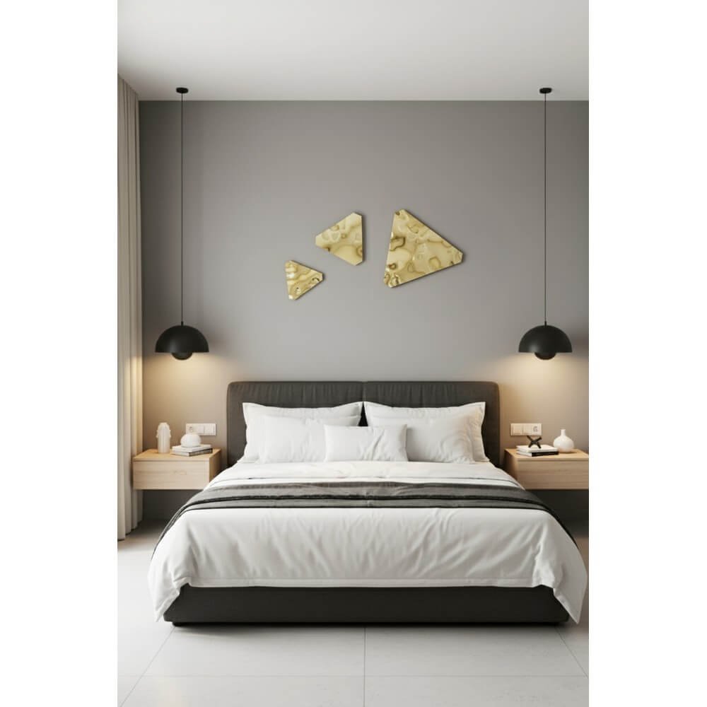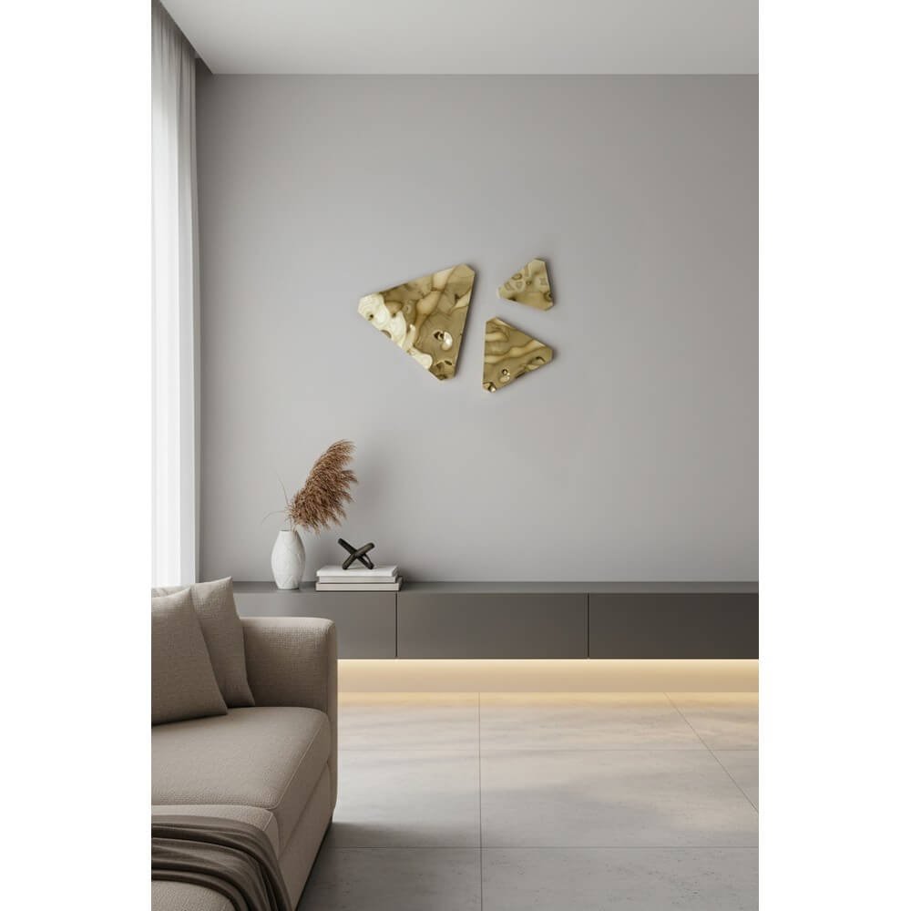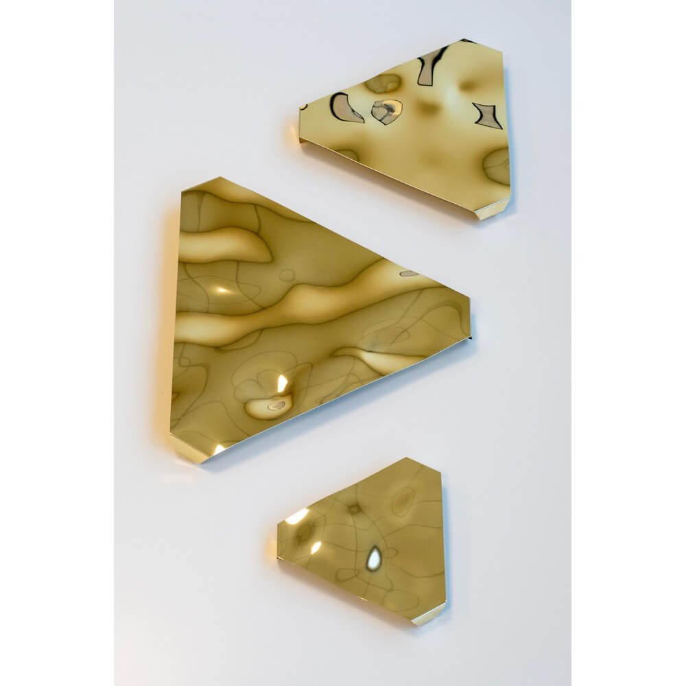 Il Set di 3 decorazioni da parete in alluminio lucidato effetto bumps – Miroir è la scelta ideale per chi desidera arricchire i propri ambienti con un tocco di design contemporaneo e raffinato. Realizzate in alluminio di alta qualità, queste decorazioni da parete si distinguono per la finitura oro lucida e iridescente, che valorizza ogni spazio con giochi di luce sofisticati e riflessi dorati. Il design geometrico asimmetrico e le superfici lavorate a rilievo donano profondità e movimento, trasformando la parete in una vera opera d’arte moderna. Le tre dimensioni – 35,5 cm, 25 cm e 18,5 cm – permettono una composizione dinamica e personalizzabile, adattandosi perfettamente sia a contesti minimalisti che a interni più classici o professionali, come soggiorni, ingressi, camere da letto, uffici o boutique. L’alluminio, leggero ma resistente, garantisce una lunga durata e una facile installazione, mentre la finitura dorata esalta la luminosità degli ambienti, rendendo ogni parete un punto focale di grande impatto visivo. Il set Miroir esprime al meglio il suo valore in spazi dove la luce naturale o artificiale può esaltare le superfici specchiate, regalando ogni giorno un’esperienza visiva sofisticata e coinvolgente.