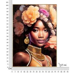 Dipinto su tela con intelaiatura in legno raffigurante una donna in abiti tradizionali e con fiori sulla testa. Completo di cornice in metallo dorato.
