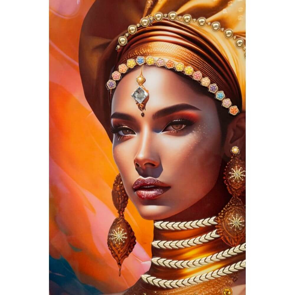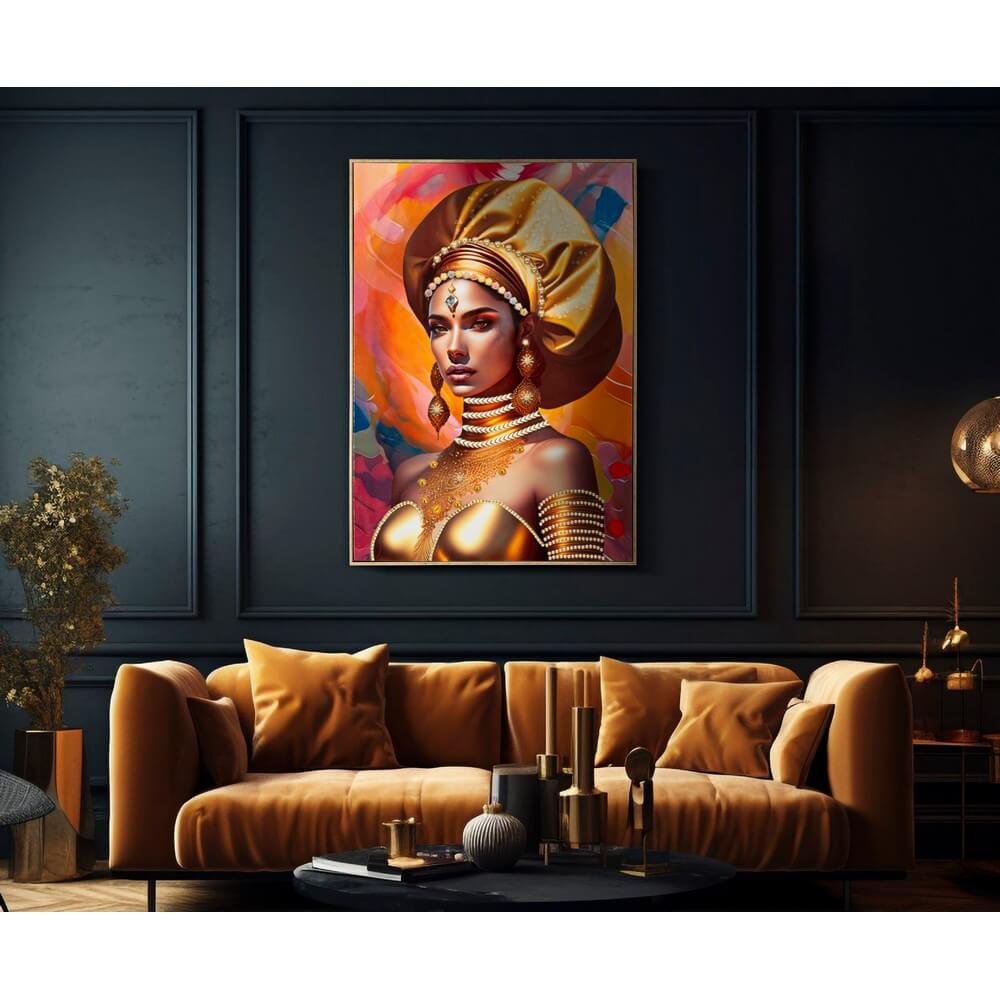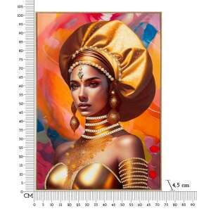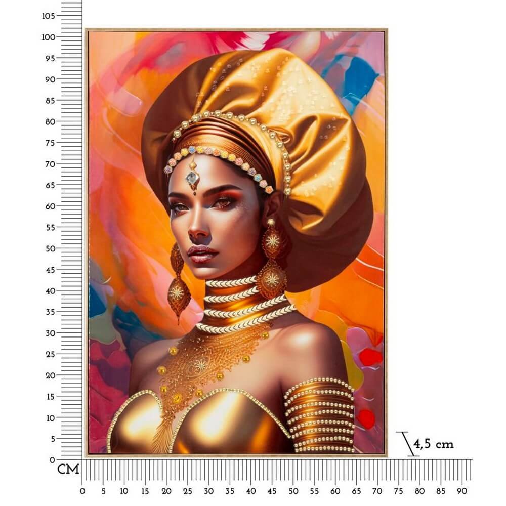Dipinto su tela con intelaiatura in legno raffigurante una donna in abiti tradizionali e con turbante. Completo di cornice in metallo dorato.