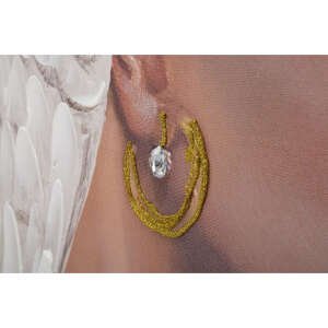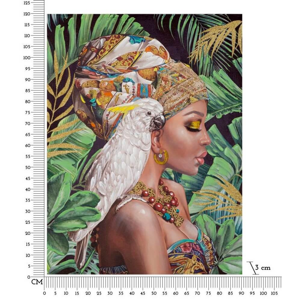 Dipinto su tela completo di telaio in legno raffigurante una donna con un pappagallo in un ambiente naturale. I colori accesi e vivaci e le eleganti applicazioni in tessuto donano un tocco di eleganza.
