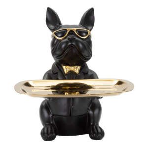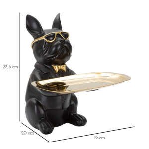 Simpatica statuetta a forma di cane dal design ispirato ai cartoon con occhiali da sole e papillon dorati con in mano un pratico vassoio anch’esso dorato che può essere utilizzato come porta oggetti.