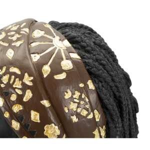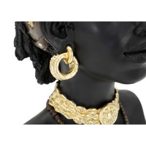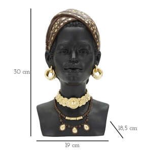 Statua a forma di testa di donna con copricapo e gioielli ispirati alla tradizione delle tribรน primitive.