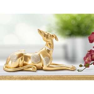 Elegante statua di cane sdraiato dorato con particolari decorazioni color argento
