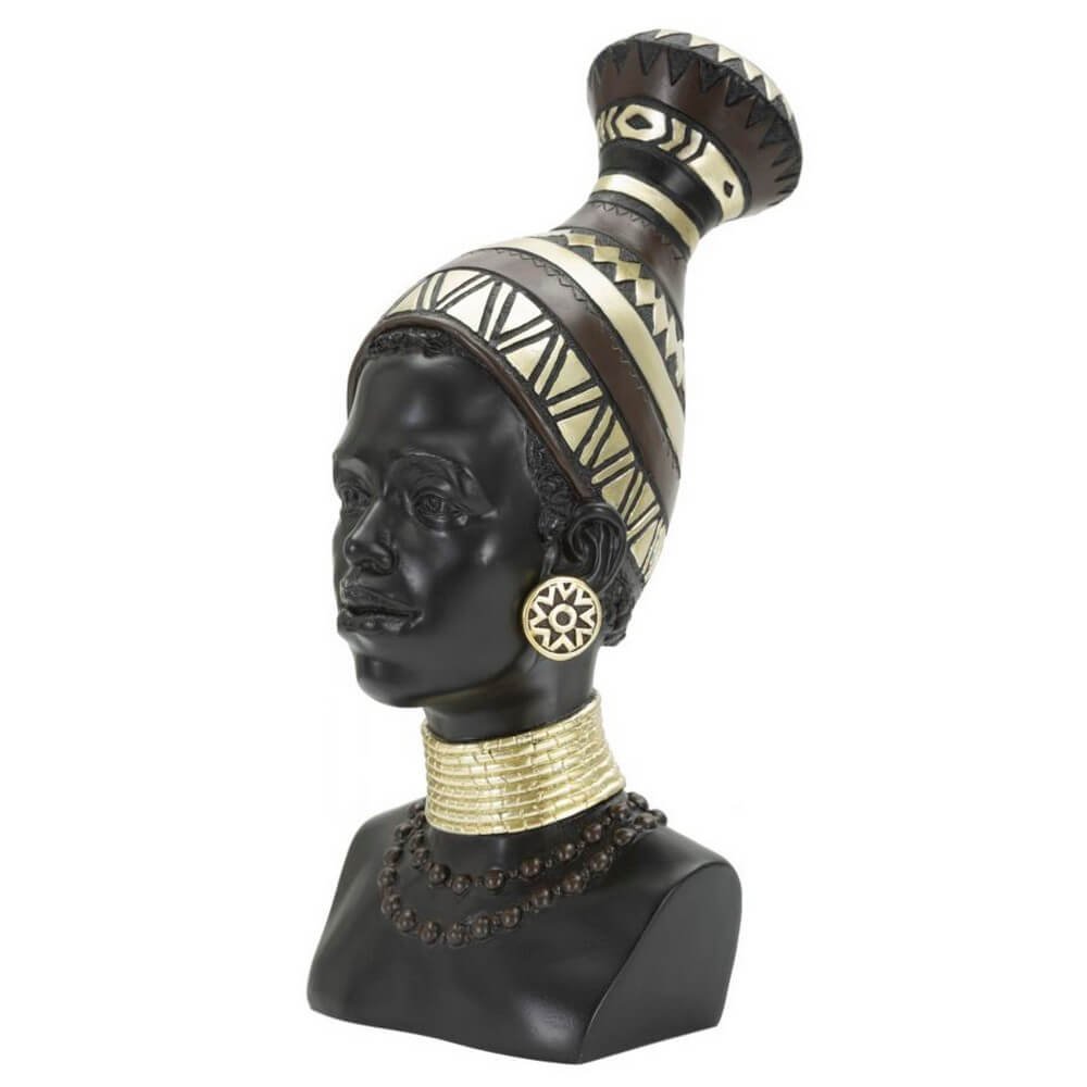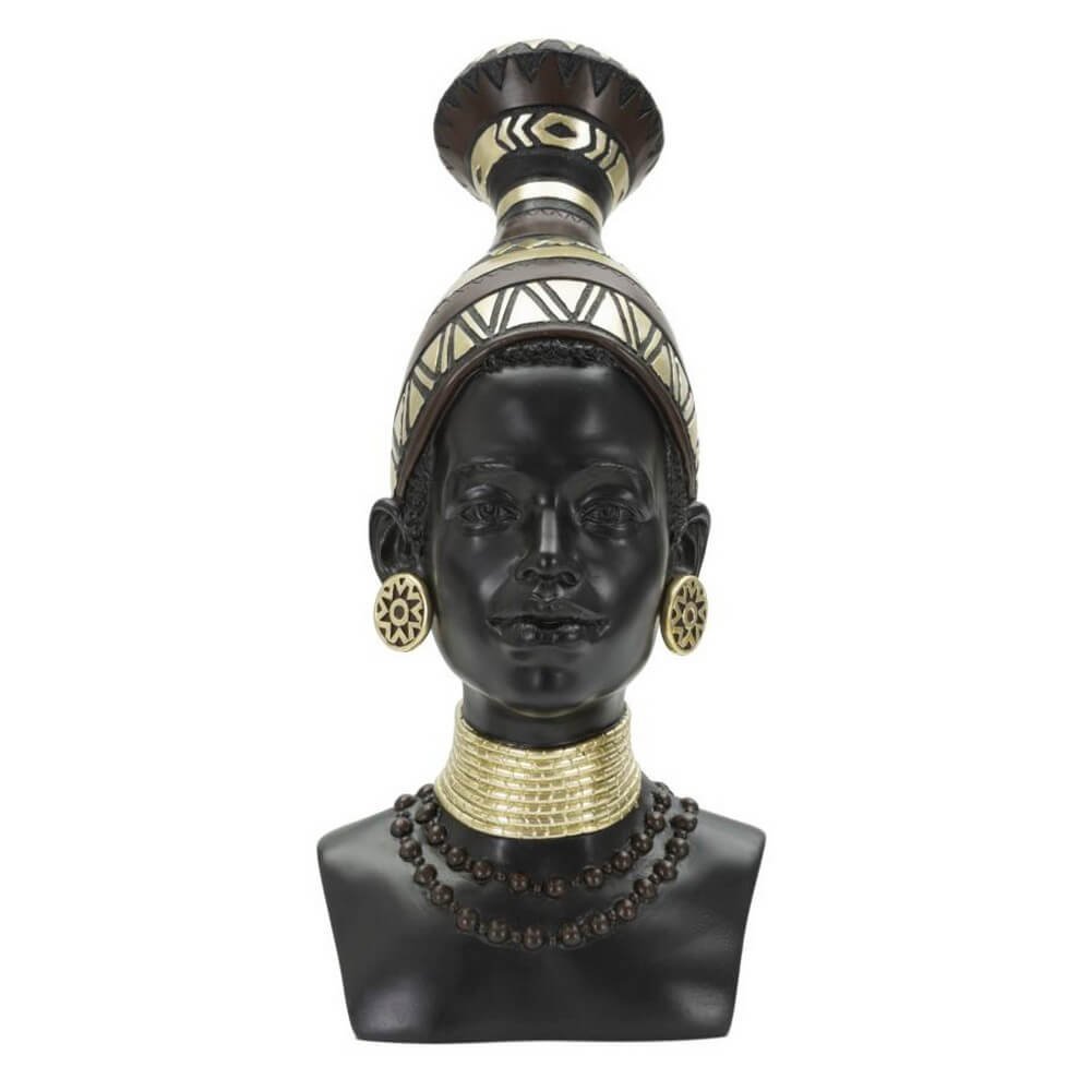 Statua a forma di testa di donna con copricapo e gioielli ispirati alla tradizione delle tribù primitive.