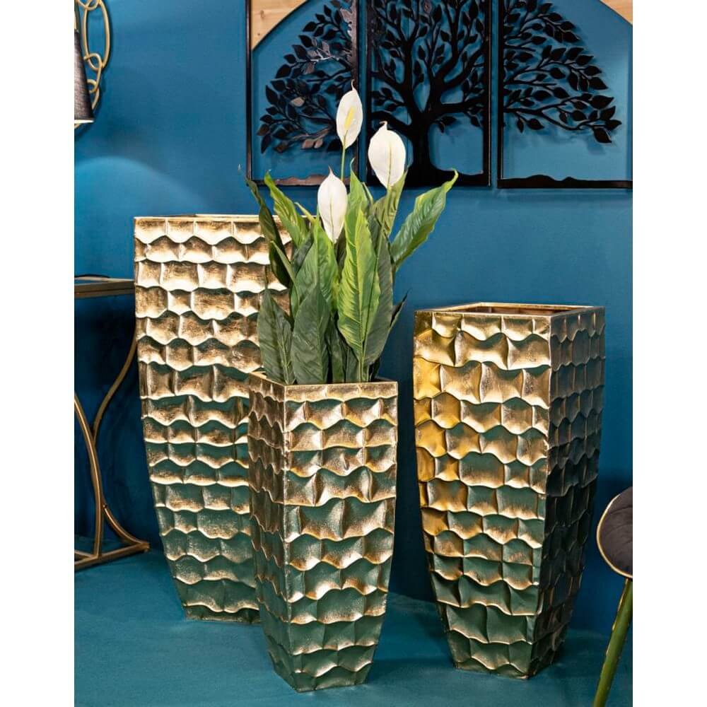 Set di 3 vasi quadrati in metallo dorato con eleganti decorazioni irregolari in rilievo.