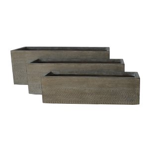 Il Set di vasi in Fibra sintetica cm 75x27x28 – EARLE è un’elegante soluzione d’arredo che unisce design moderno e funzionalità, perfetta per arricchire con stile ambienti interni ed esterni. Realizzati in fibra sintetica, un materiale resistente e leggero, questi vasi rettangolari presentano una superficie marrone raffinata con una texture incisa a rilievo, che dona profondità e dinamismo visivo. Le linee geometriche pure e il motivo decorativo tono su tono li rendono ideali per ambienti contemporanei, minimalisti o naturali, esaltando sia piante verdi che composizioni secche. Il set comprende tre vasi di diverse dimensioni (grande 75x27x28 cm, medio 65x21x22,5 cm e piccolo 58x16x17,5 cm), offrendo versatilità compositiva e praticità d’uso. Che si tratti di delimitare un angolo relax all’aperto, impreziosire un ingresso o valorizzare un living, i vasi EARLE si distinguono per la loro eleganza sobria e la capacità di trasformare qualsiasi spazio con un tocco di design sofisticato.