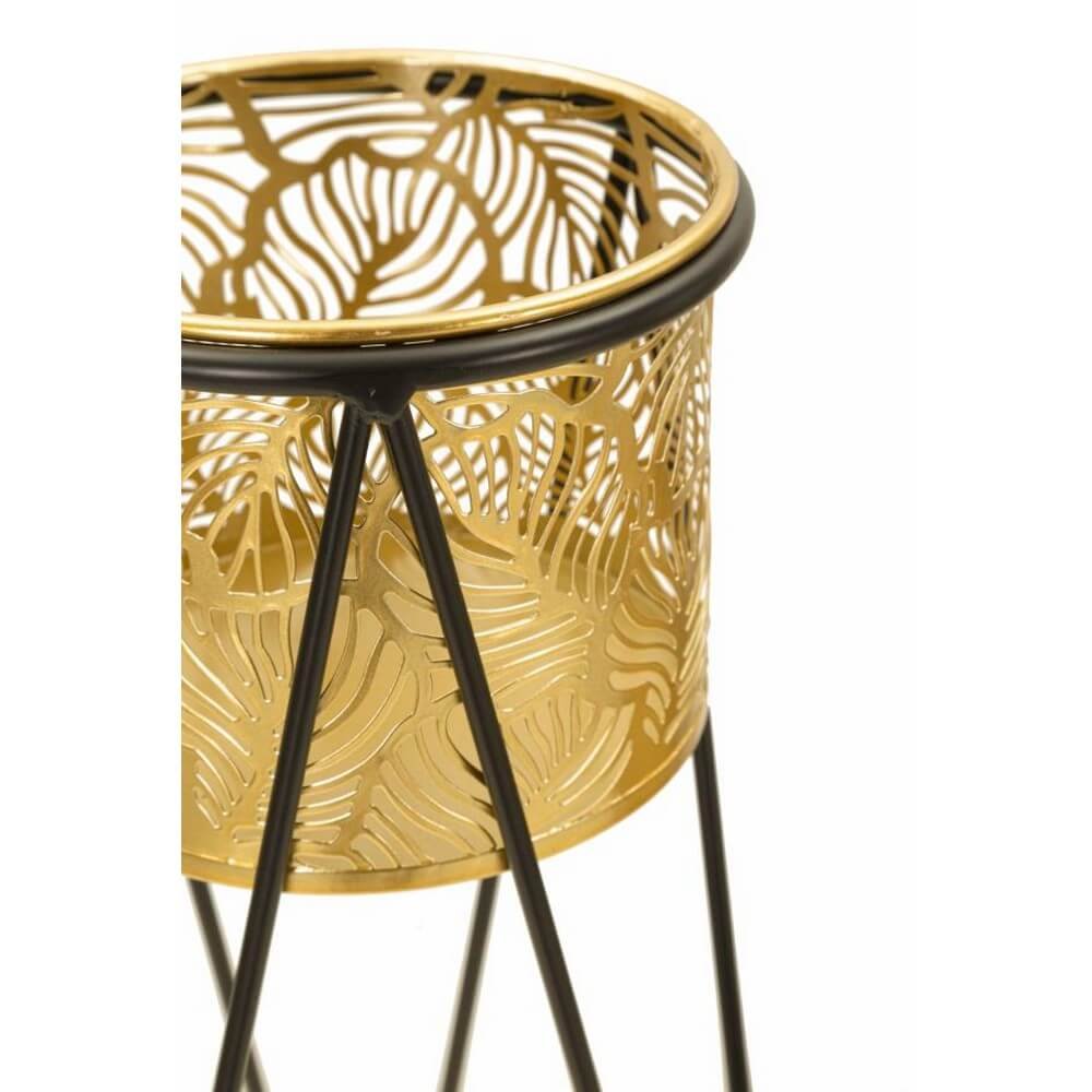 Coppia di portavasi in metallo dorato elegantemente decorati con intagli che richiamano le foglie. Completi di supporto in metallo nero. I vasi sono removibili dai supporti.