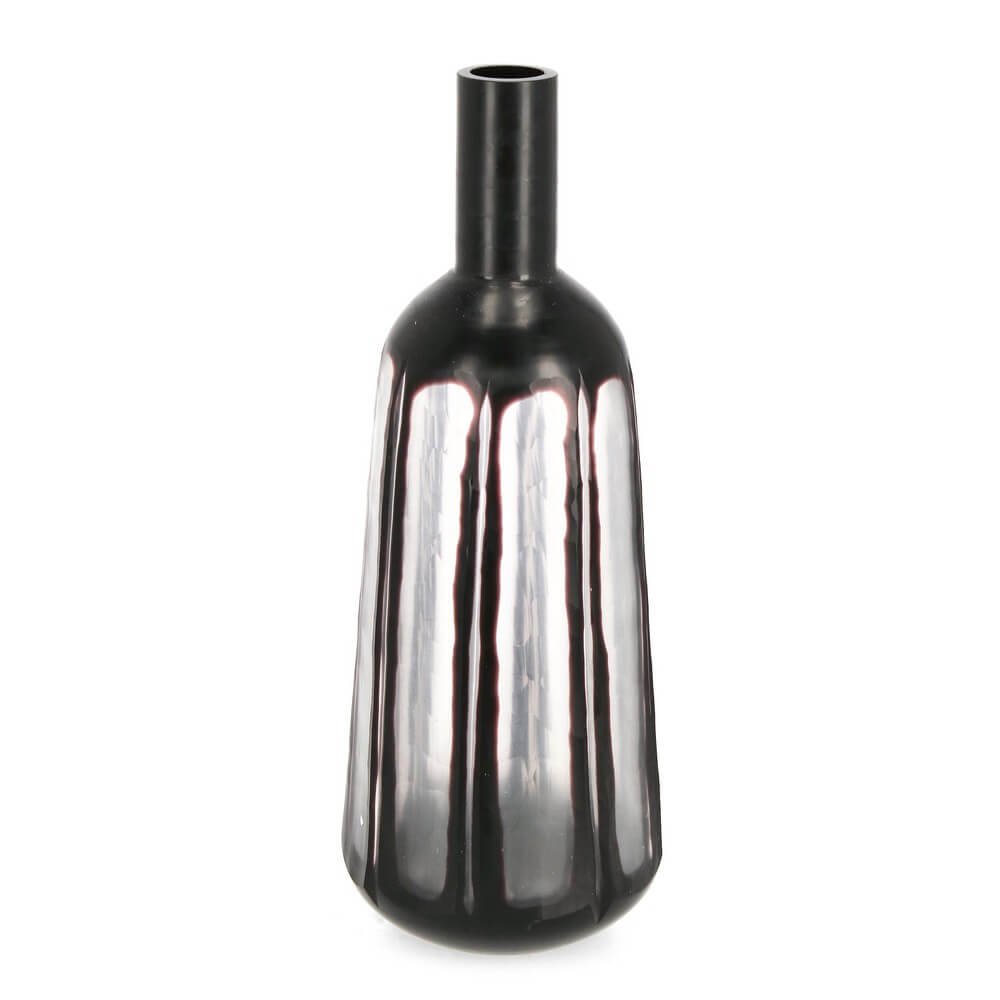Il Vaso in Vetro Nero Moderno da Interno H38 cm – HASSAN è un elemento decorativo di forte impatto visivo, perfetto per arricchire ambienti contemporanei con un tocco di eleganza decisa. Realizzato interamente in vetro soffiato a mano, questo vaso presenta una superficie lucida e sinuosa, caratterizzata da tonalità nere intense interrotte da riflessi verticali più chiari che ne accentuano la profondità e la lavorazione artigianale. Ogni pezzo è unico, grazie alle naturali variazioni di colore e finitura che rendono ogni vaso irripetibile. Il design slanciato con collo stretto e corpo allungato lo rende ideale sia come centrotavola decorativo che come complemento sofisticato per mensole, consolle o mobili da soggiorno. Il Vaso HASSAN è perfetto per interni raffinati che abbracciano lo stile moderno, industriale o minimalista, e si presta anche ad arricchire ambienti contract come hall o uffici. L’esperienza visiva che offre è quella di un oggetto d’arte contemporanea, capace di trasformare lo spazio con discrezione e personalità.