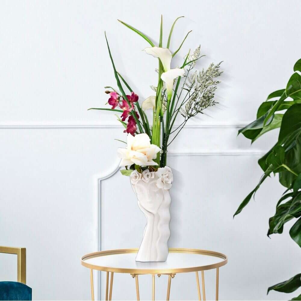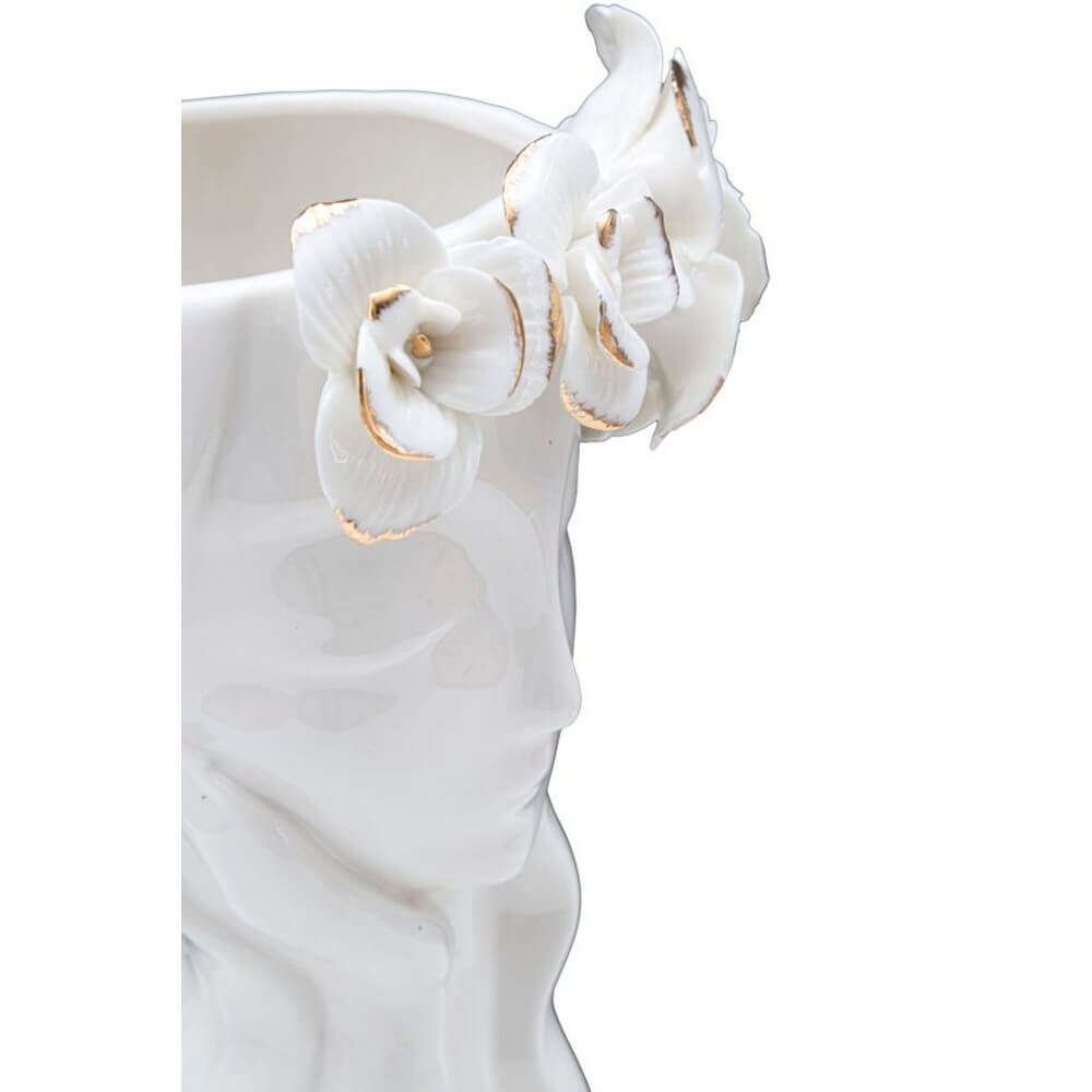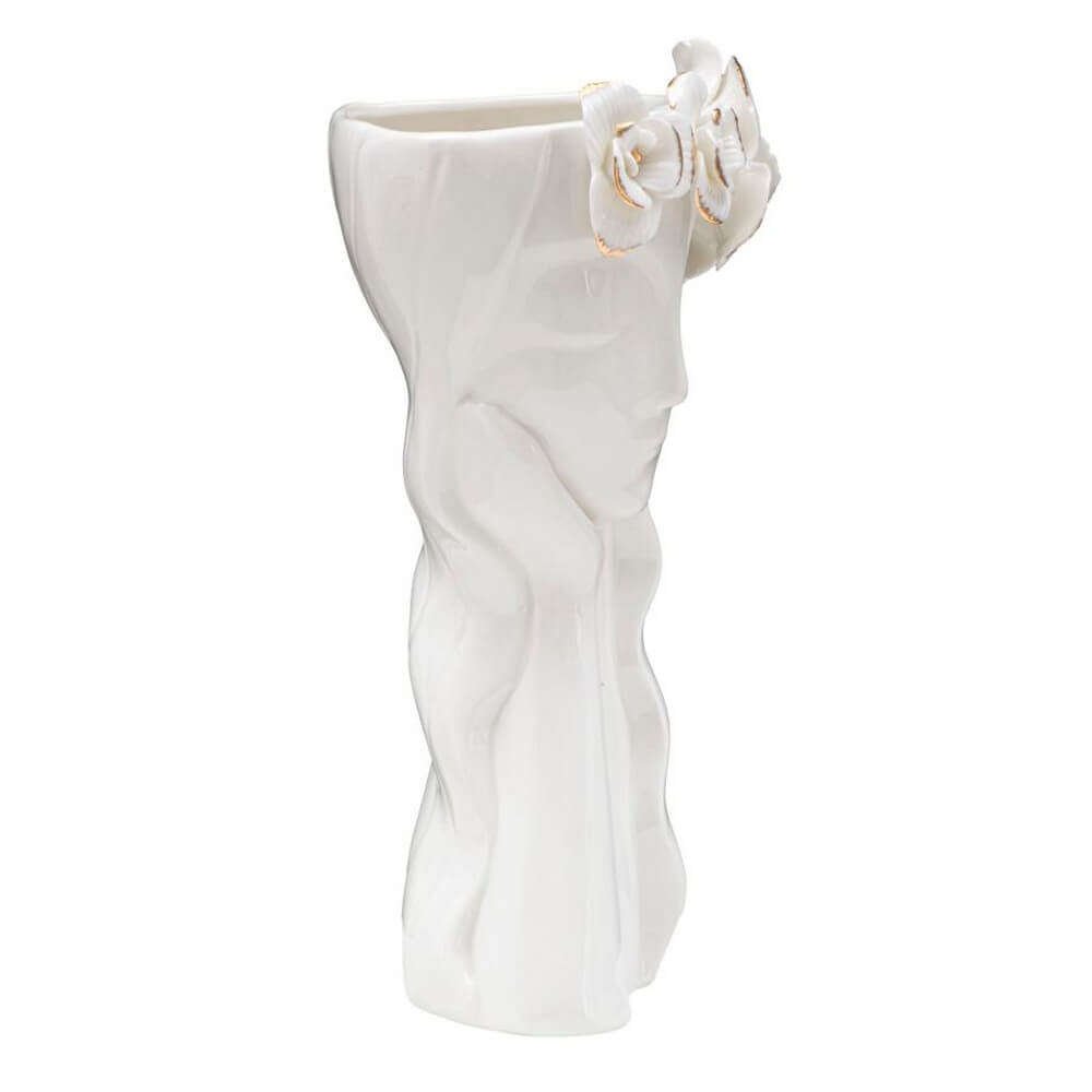 Elegante vaso in porcellana bianca con delicate decorazioni dorate. Il particolare design ispirato ad un volto femminile e le forme morbide donano un tocco di grazia e bellezza.