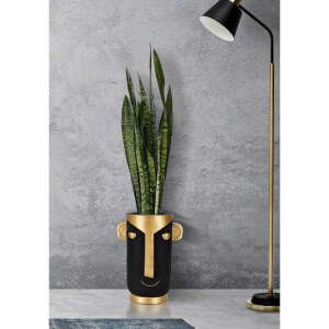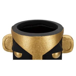 Vaso raffigurante un volto stilizzato con eleganti tratti dorati ispirato alle tribù primitive.