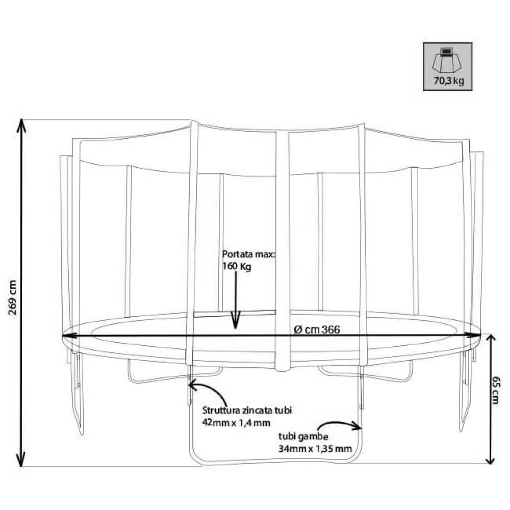 Il Trampolino elastico da 366 in Plastica Acciaio cm 366x366x269 – BOEING è il compagno ideale per il divertimento all’aperto in totale sicurezza. Realizzato con una robusta struttura in acciaio zincato, composta da tubi di 42 mm di diametro e gambe da 38 mm, garantisce una portata massima di 160 kg, rendendolo adatto sia ai bambini che agli adulti. Il telo elastico, circondato da una rete protettiva ad alta resistenza, è fissato saldamente con materiali plastici rinforzati, pensati per resistere nel tempo. Il design tondo, dalle generose dimensioni di 366 cm di diametro e 269 cm di altezza complessiva, si distingue per il vivace colore blu e per i dettagli gialli e neri che ne potenziano l’impatto visivo. Lo stile sportivo ed energico si adatta perfettamente a giardini e spazi esterni, offrendo un’area giochi elegante e sicura. Il trampolino BOEING unisce estetica dinamica e materiali di alta qualità per un’esperienza di salto fluida ed entusiasmante, ideale per l’attività fisica all’aria aperta, momenti di svago in famiglia o sessioni di allenamento leggero.
