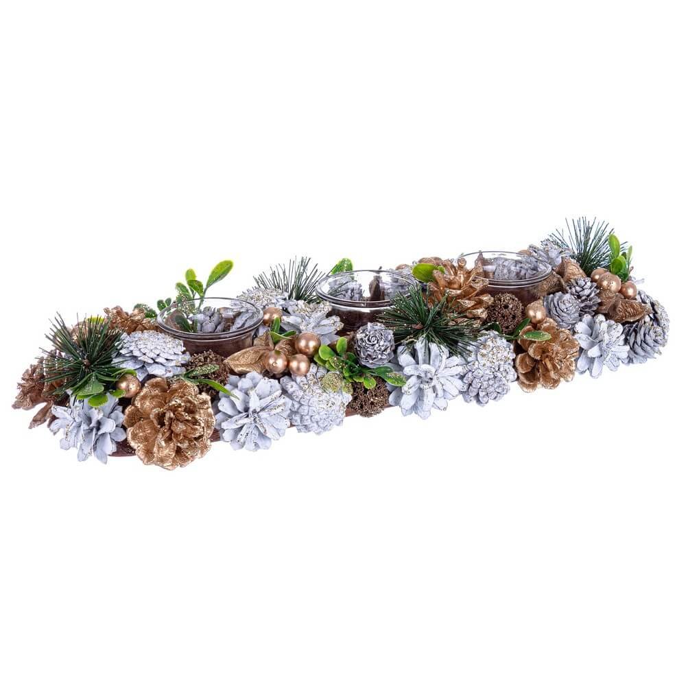 Portacandele Triplo Martha Rettangolare Bianco-Oro con Pigna (4 Pezzi)